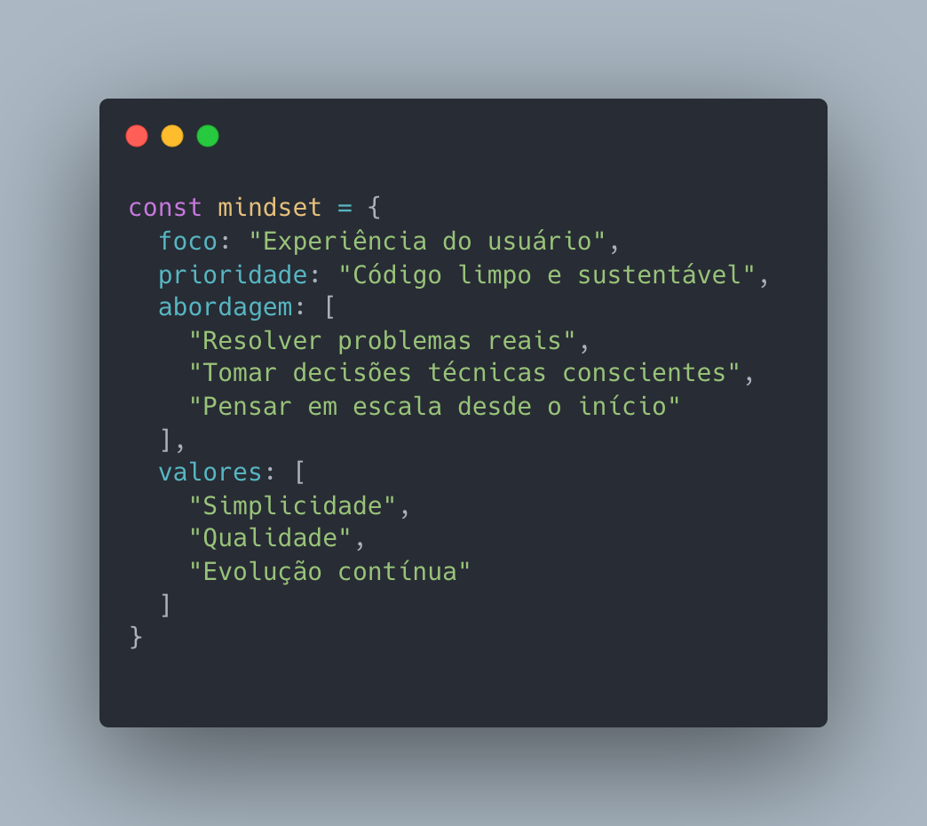 Tenho foco em aprendizado contínuo, resolução de problemas e na construção de aplicações mobile escaláveis, sempre com atenção às necessidades do usuário, refletindo sobre como cada experiência contribui para meu crescimento profissional e para a evolução do time.